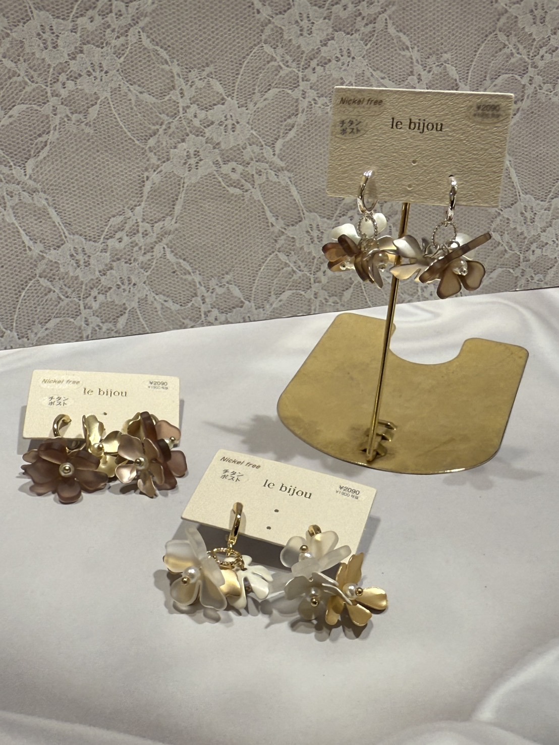シーグラスのような半透明の花びらと、マットな花びらで出来ているのがポイント!です( ¨̮ ) カラーは、3色ご用意しております♪ 涼しくなってきたこの時期に、耳元から秋冬を楽しんでみてはいかがでしょうか(^o^)?