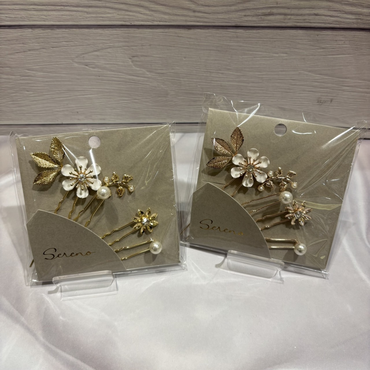 上品なフラワーデザインが特徴のこちらのUピン、繊細な花モチーフにパールとビジューがあしらわれており、やわらかい印象に♡ 結婚式やお呼ばれなど、特別な日にぴったりです。 花・葉・パールのデザインが少しずつ違うので、まとめて使えば華やかに、1本ずつ使えばさり気なく。アップスタイルやハーフアップにも合わせやすくオススメです。 カラーはゴールド、ピンクゴールドの2色展開です☆