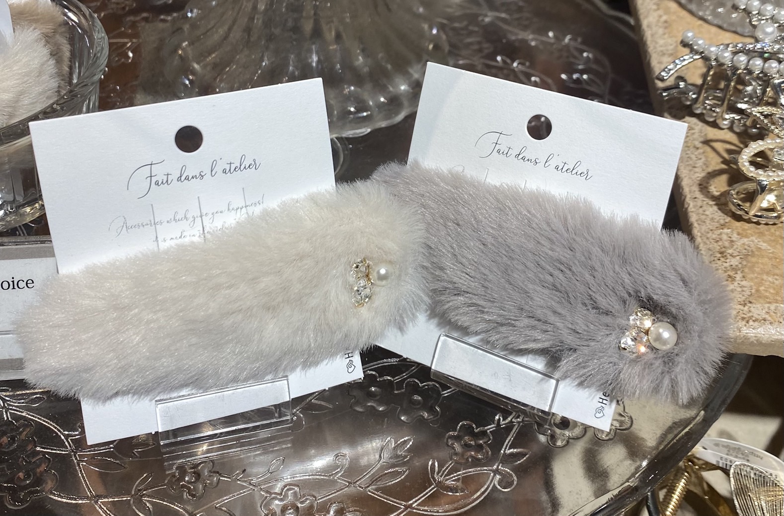 本日、ご紹介するアイテムは今の時期にぴったりな ビジュー付きのモコモコヘアピンになります!