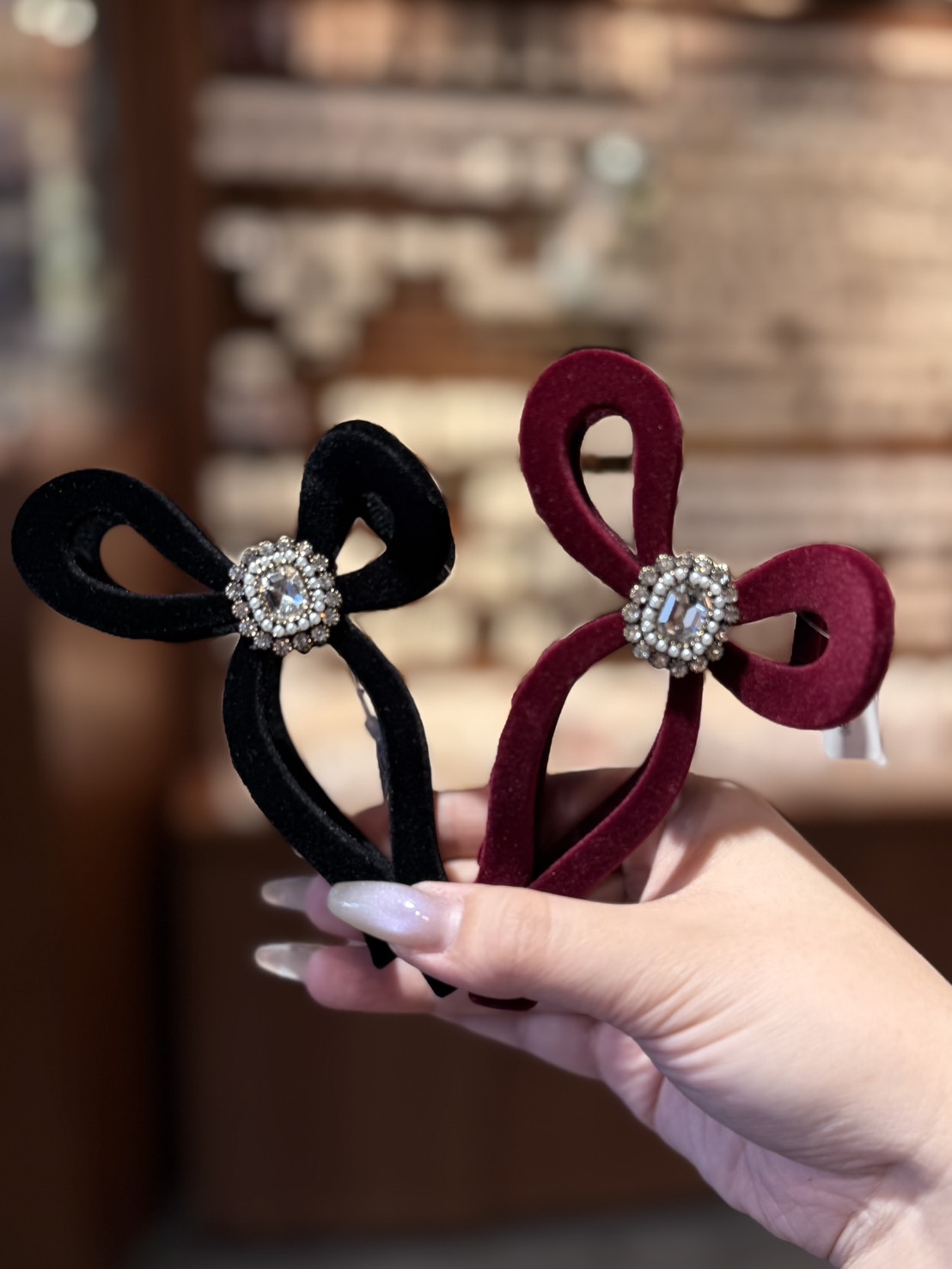 本日、ご紹介するアイテムは 大人気のビジュー付きフロッキーリボンバンスです🎀♡