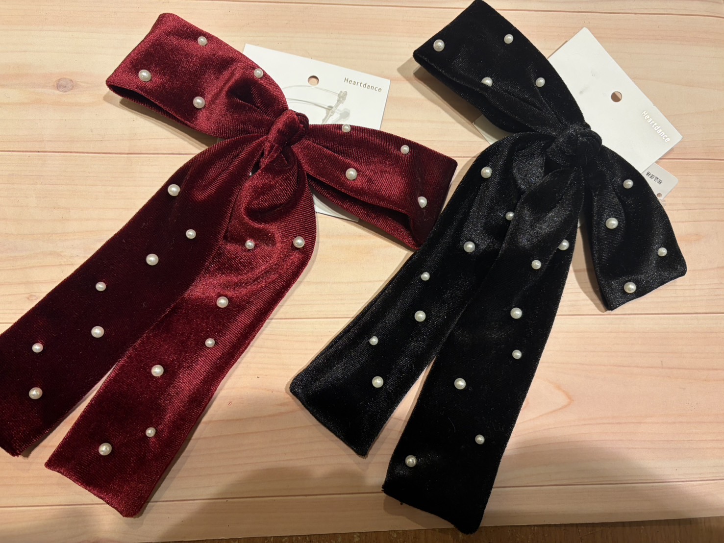 1、ベロアの素材とパールが組み合わさって、とても素敵! 2、リボンが長めなので、つけると揺れて可愛い! 3、ポニーは、結ぶだけなのでお子様用にもおすすめ! 4、全体にちりばめられているパールが、あまり見かけないデザイン! 5、どんなお洋服にも合う、優秀アイテム! 以上、おすすめポイントでございました(⁎⁍̴̛ᴗ⁍̴̛⁎)