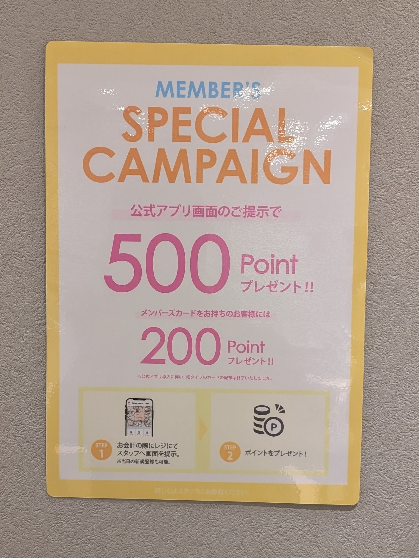 まだメンバーズ会員ではない方も、その場でアプリ会員にご登録頂くと500Pがもらえます!(メンバーズカードをお持ちの方も、アプリでログインした画面のご提示で500Pプレゼントになりますのでアプリのインストールをお願いいたします!)