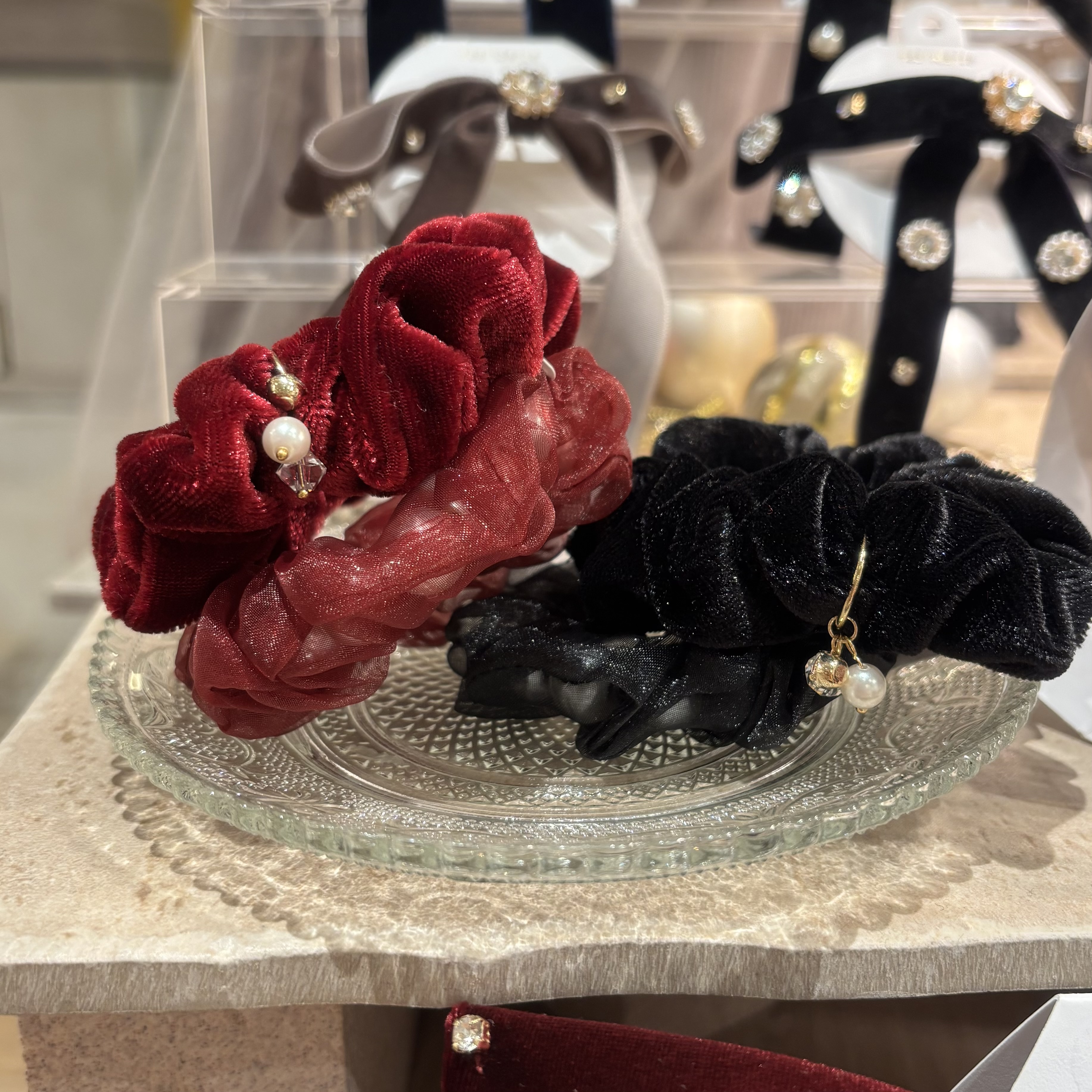 ベロア素材のシュシュにはパールとビジューのチャームがついており、もうひとつはパールをオーガンジーで包んだシュシュになっています✨