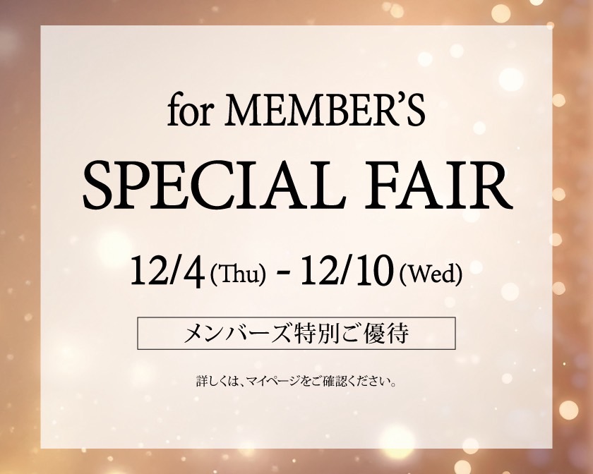 12/4 (木) ~ 12/10(水) の期間中、 日頃の感謝の気持ちを込めて会員様へ特別ご優待フェアを開催いたします! 詳しくは、マイページをご確認ください。 (※マイページへは12/4 (木) から表示されます)
