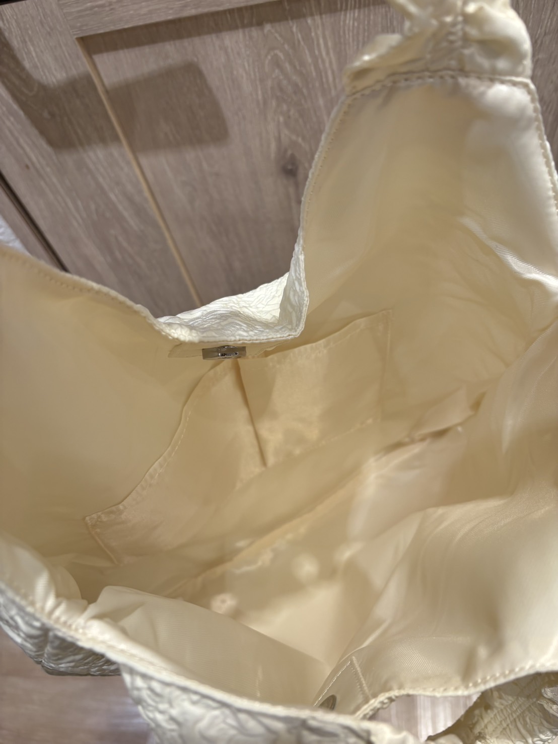生地はシャーリング とても肌触りがいいです♪ A4サイズファイルも縦にしても横にしても入ります! バッグの中にはポケットがあり携帯入れによいかと思います^_^
