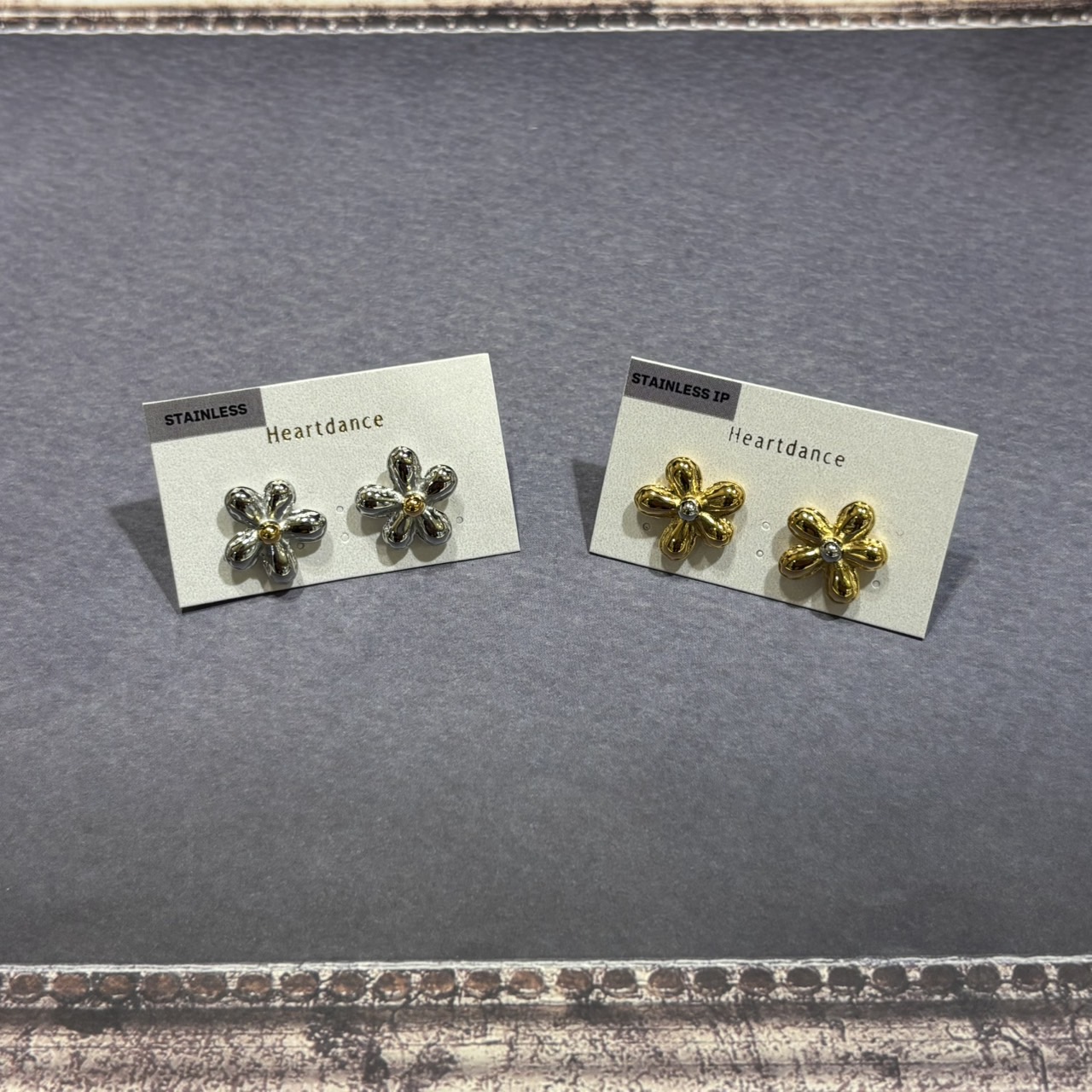 ぷっくりとした立体感のあるフラワーモチーフピアス。花びらと中央のストーンがバイカラーでシンプルながらも存在感あり! 可愛らしいモチーフですが、メタル素材でカジュアルにも◎ また、ステンレス素材で変色やサビにも強く、お肌にも優しいので、アレルギーのある方も 安心してお使いいただけます。