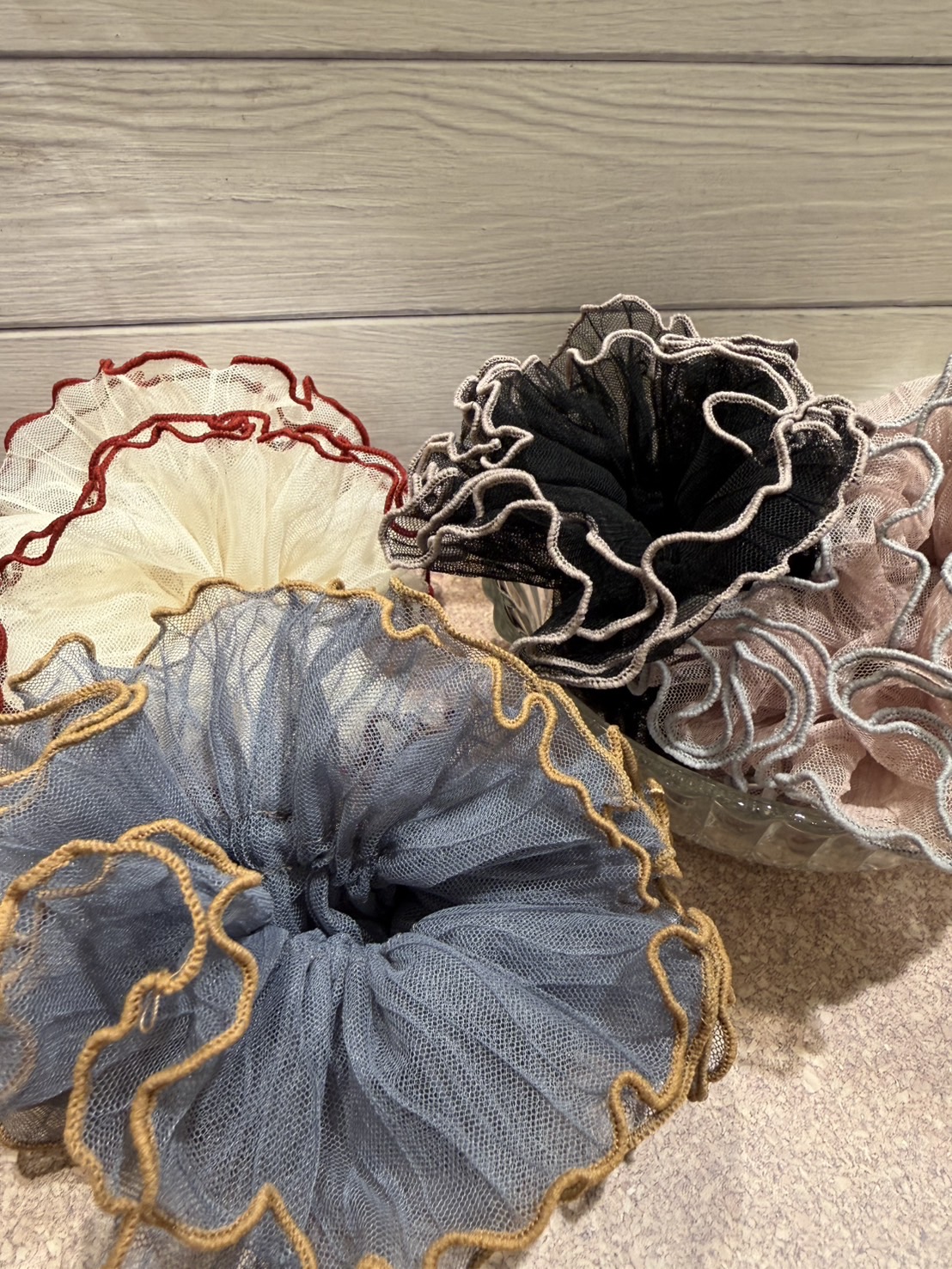 バイカラーになっているシュシュ( ¨̮ ) フリルのようなデザインも、また可愛いアイテムとなっております!♪ お色は4色ご用意していますので、