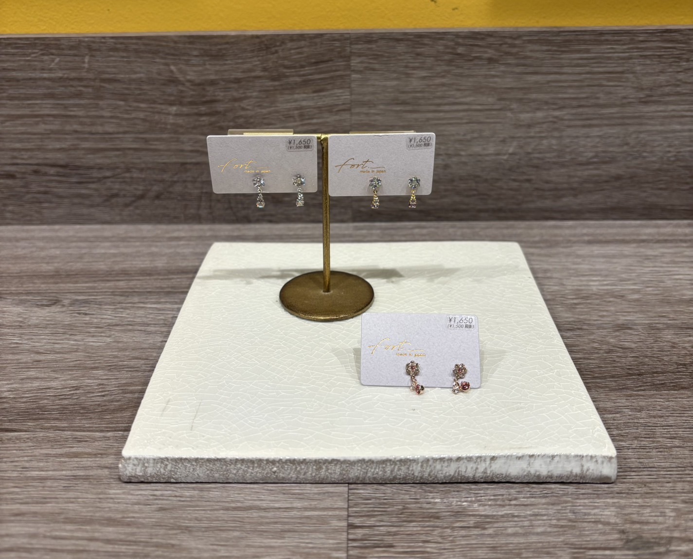 色ごとにお花のストーンの色が違いシルバーはシルバーのストーン、ゴールドには水色と紫、ピンクゴールドはピンクのストーンがついていてとても可愛く、小さいモチーフですが存在感のあるピアスとなっております♪