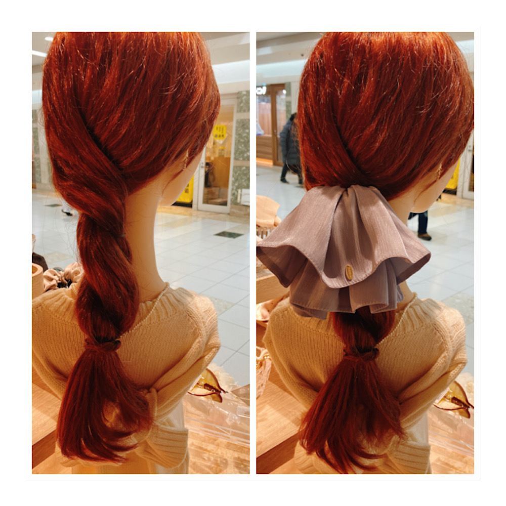 髪をふたつに分けて、ねじりながらロープ編みにして、