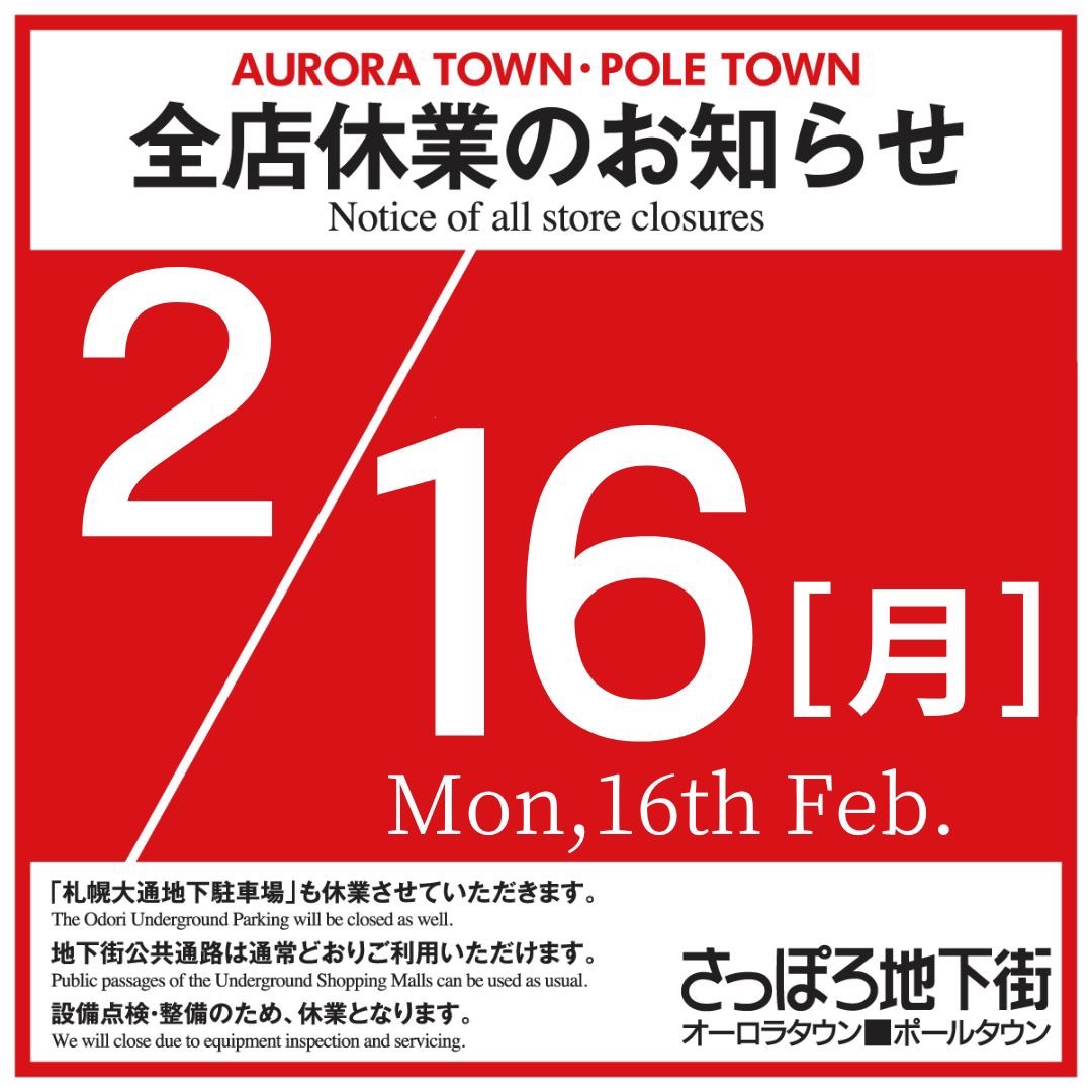 本日2/16㈪は、諸設備の点検整備のため、さっぽろ地下街全店及び大通地下駐車場を【終日休業】させていただきます。
