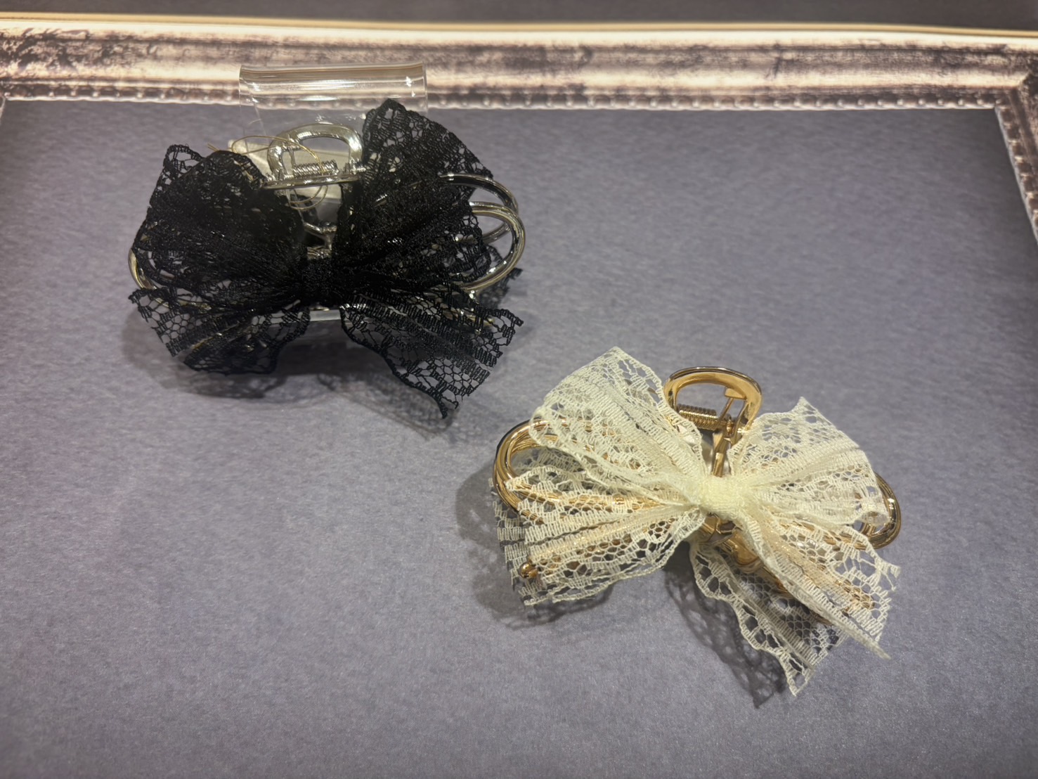 1、レースのリボンが女性らしくて、とっても可愛い! 2、髪が短めの方でも使えるサイズ感が嬉しい! 3、どちらのお色も上品で素敵! 4、甘くなりすぎないところも、ポイント高い! 5、このデザインで、お求めやすいお値段なのは凄い!