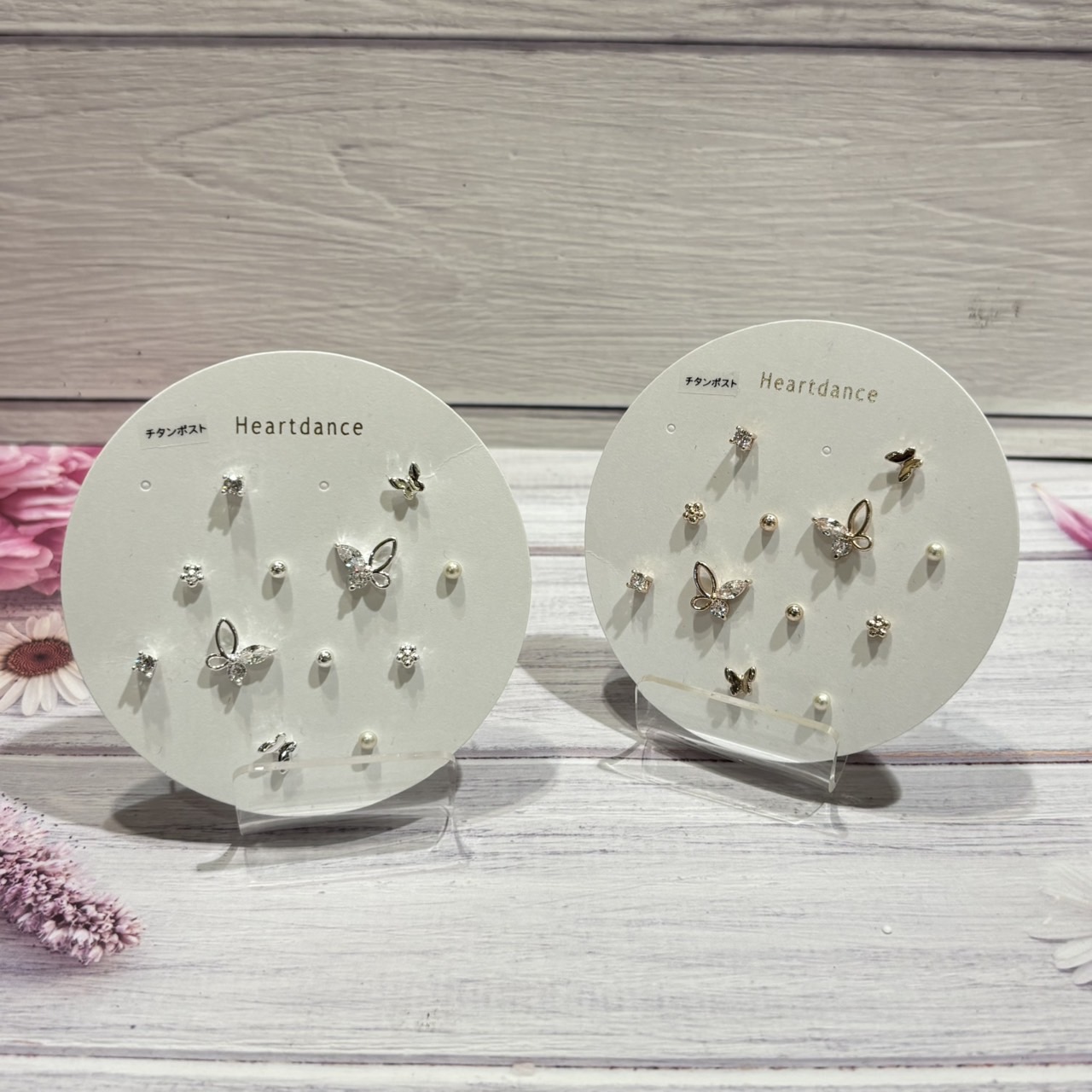 華奢なバタフライモチーフが可愛いこちら、蝶々だけでなく、お花やストーンなど、6ペアも入ったセットピアスです♡ その日の気分やコーデに合わせてはもちろん、小粒デザインで重ね付けにもピッタリ◎ また、チタンポストで肌に優しくアレルギーが起きづらい素材です。 カラーはシルバーとピンクゴールドの2色展開☆