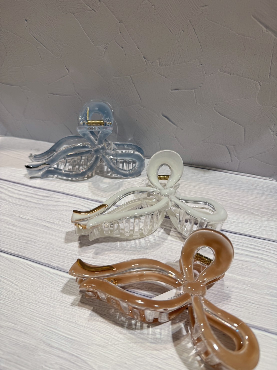 リボンの形をしたアクリルバンス! 軽くて大きめなので、髪もまとめやすくなっております。 ゴールド、シルバーのニュアンスのパーツもリボンの裾についていたりして、どんなファッションでも合わせやすいアイテムです( ¨̮ ) カラーも3色ご用意していますので、是非店頭にてご覧下さい☆!