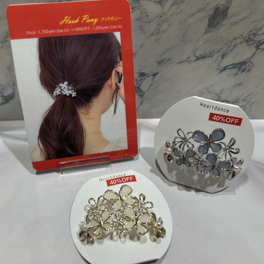 この他にもカラーの造花アイテムやパールメインのヘアアイテムなど様々な商品を展開しております。