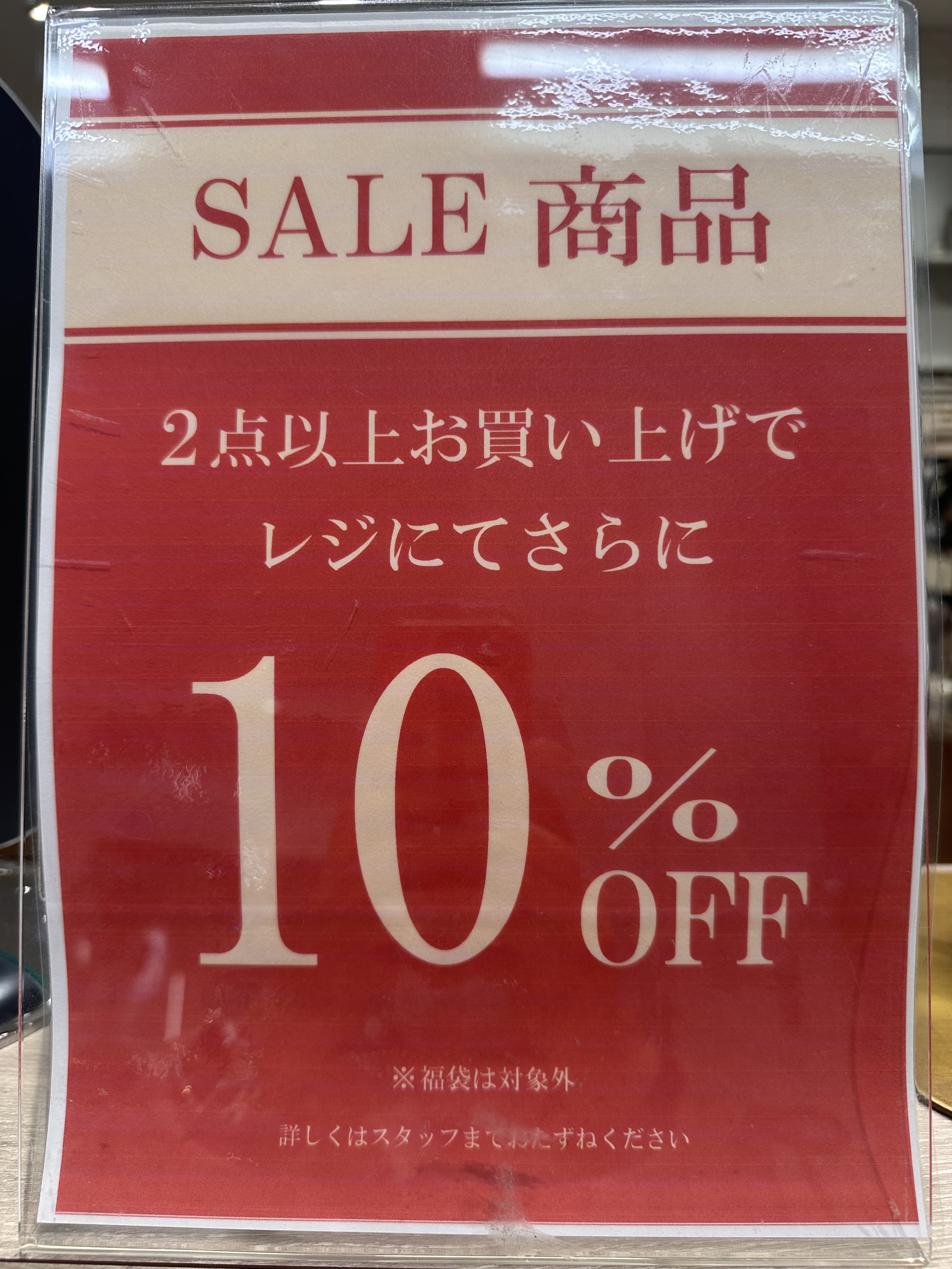 1月9日(金)~1月12日(日)の4日間で、SALE商品2点以上のお買い上げでレジにてさらに10%OFFとなります⟡.·*.