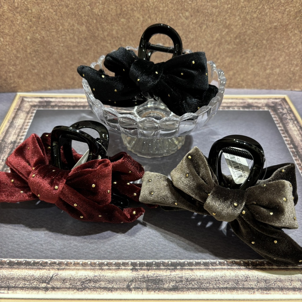 こちらのバンスクリップ、秋冬にピッタリのベロア素材で、小さなゴールドのドットが散りばめられており、動く度にキラッと輝いてアクセントに♡ カラーは落ち着いた3色展開で、オフィスやお出かけにも使いやすいデザインです。 大きすぎず、ハーフアップやボブの方も使いやすいサイズ感です。