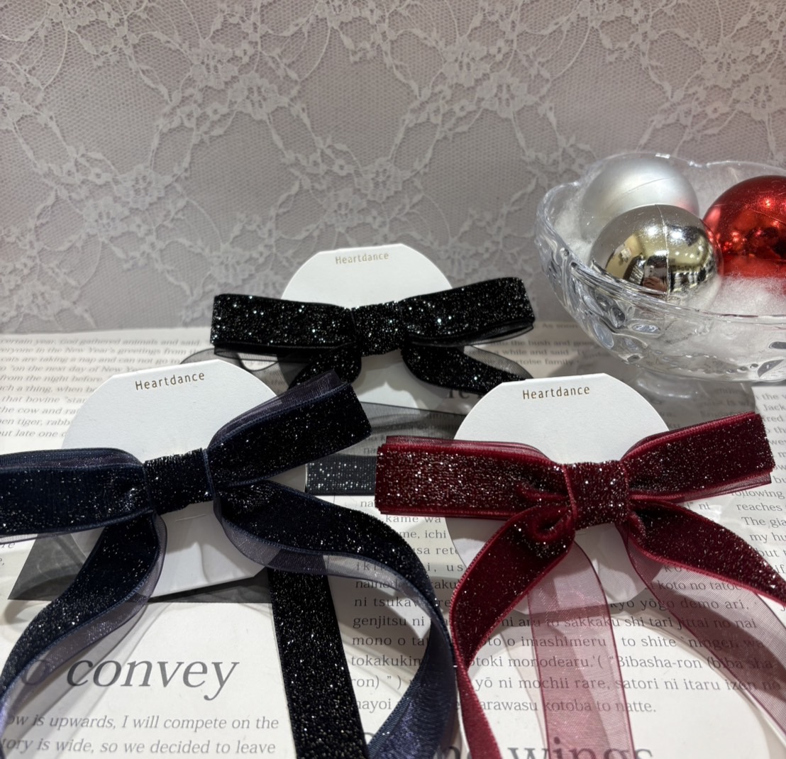 大小のラメが上品に輝くこちら! リボンはオーガンジーとベロアの二重デザインで、上品さを更にUP☆