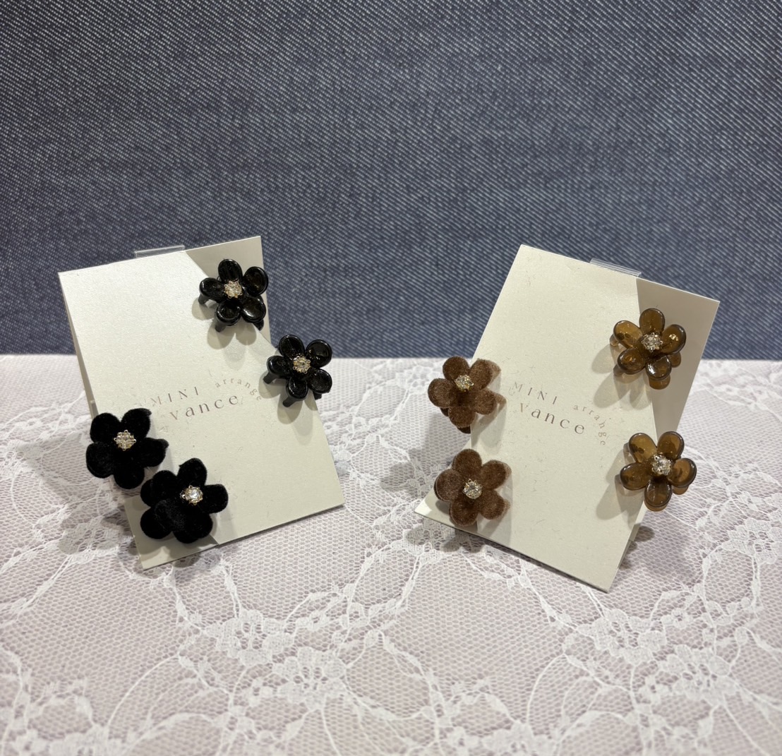 そんな時にこちらのアイテムであれば、 アクリルデザインで軽い印象に♡ ベロアデザインで季節感満載のコーデに♡ 両デザインを組み合わせると季節感を出しつつ抜け感のある印象♡ と1セットで様々な雰囲気でお使い頂けます!