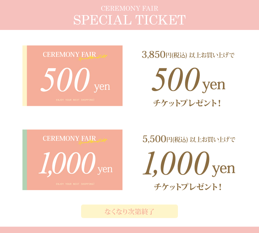 2月20日(金)から、 購入金額に応じて、次回のお買い物に使える お得なスペシャルチケットをプレゼント! チケット詳細は下記をチェック!