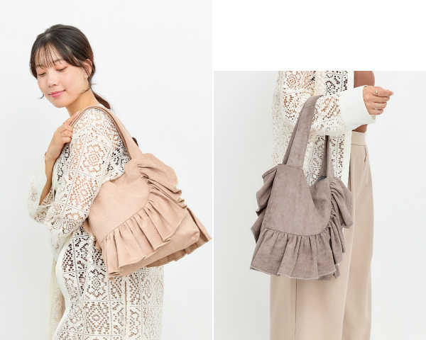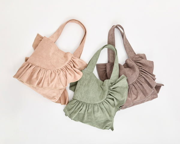 フリルトートバッグ No. 90135 price : 4,290yen (tax in) 3color : (画像左から) ベージュ、グリーン、チャコールグレー