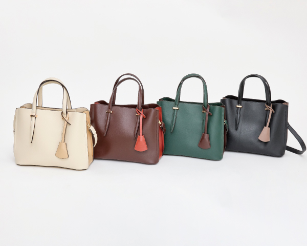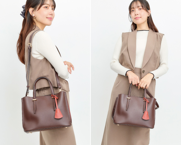 チャーム付配色2wayバッグ No. 90134 price : 6,270yen (tax in) 4color : (画像左から) アイボリー、ブラウン、グリーン、ブラック