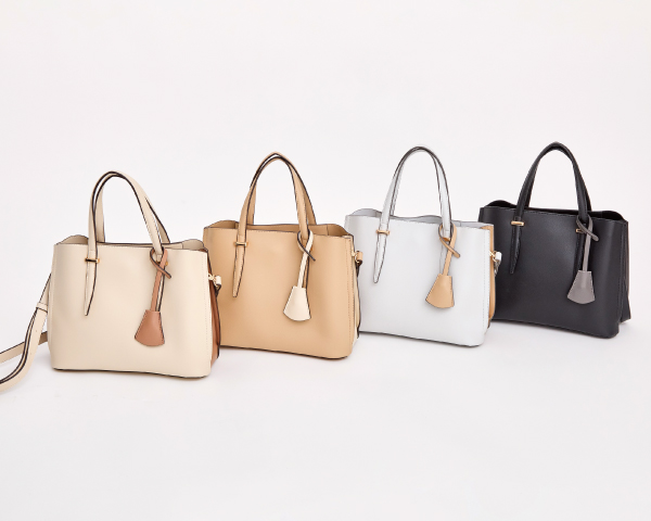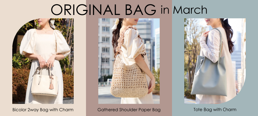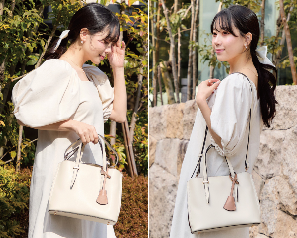 チャーム付配色2wayバッグ No. 90159 price : 6,270yen (tax in) 4color : (画像左から) アイボリー、ベージュ、 ライトブルー、ブラック